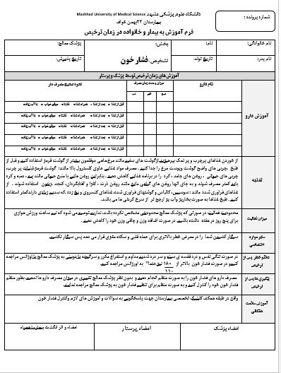 فرم ترخیص فشار خون بخش مراقبت های ویژه
