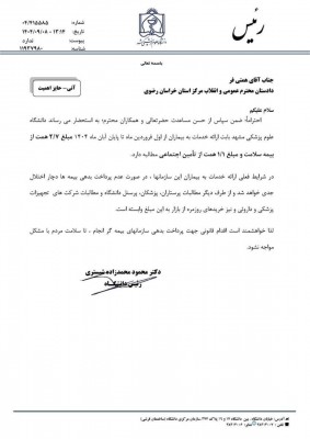 اخباراصلي تازه ترین خبرها 09 آذر 1404 بازدید: 8 مکاتبات رییس دانشگاه علوم پزشکی مشهد به دادستانی استان برای اقدام قانونی درجهت پرداخت مطالبات